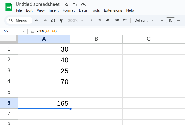 In cell A6, you may see the number 165, but this isn’t a number I entered manually. Instead, it’s a formula using the range of cells we’ve mentioned to calculate the total. You can see this in the Formula Bar, which is located above the spreadsheet grid.