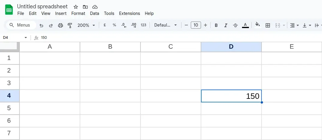 Cell D4 contains the value 150
